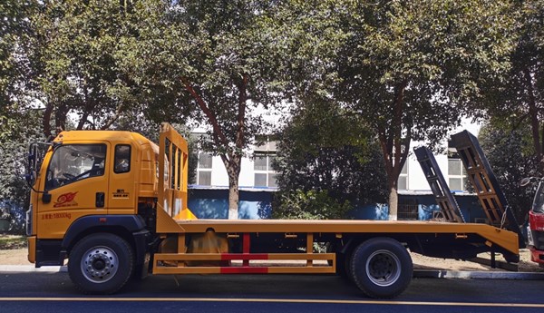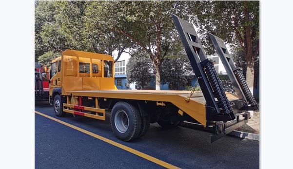 主要配置:潍柴220马力四缸发动机,国六排放标准,重汽10档变速箱,5吨的前桥,10吨的后桥,250双层大梁,轴距:5200mm,整车尺寸9000*2500/2550*3100 。原厂空调,中控锁,电动门窗,气囊座椅。装采用100*100方钢,5mm厚花纹板,标配双弹簧,双爬梯,固定后支腿。可选装纯平板,选装单节液压,单缸双节液压折叠爬梯。可拉150挖机。