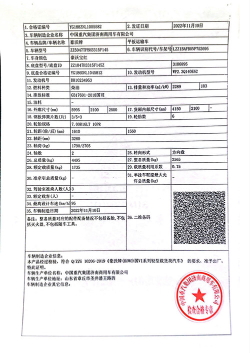 潍柴140马力国六发动机,法士特8档带高低速变速箱,3280轴距,700钢丝胎,整车尺寸:5995*2100/2250*2500,带中控,电窗,皮座椅,气喇叭,全包裹,车钥匙远程遥控玻璃升降,原厂空调。