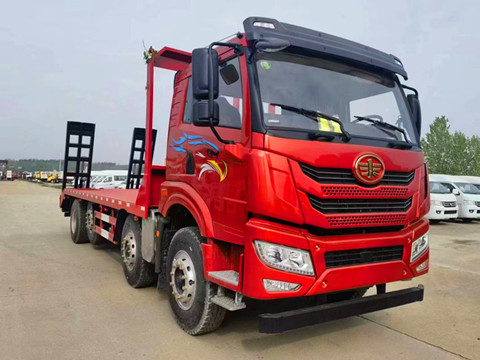 解放挖机拖板车拉21.4吨 不超载平板车,运输车装载不可拆卸的大物件,装载机,收割机等,该车有国家燃油公告和环保公告,可在全国各地上牌、办理营运证。提升桥平板拖车厂家直销:13997882988 13597840088